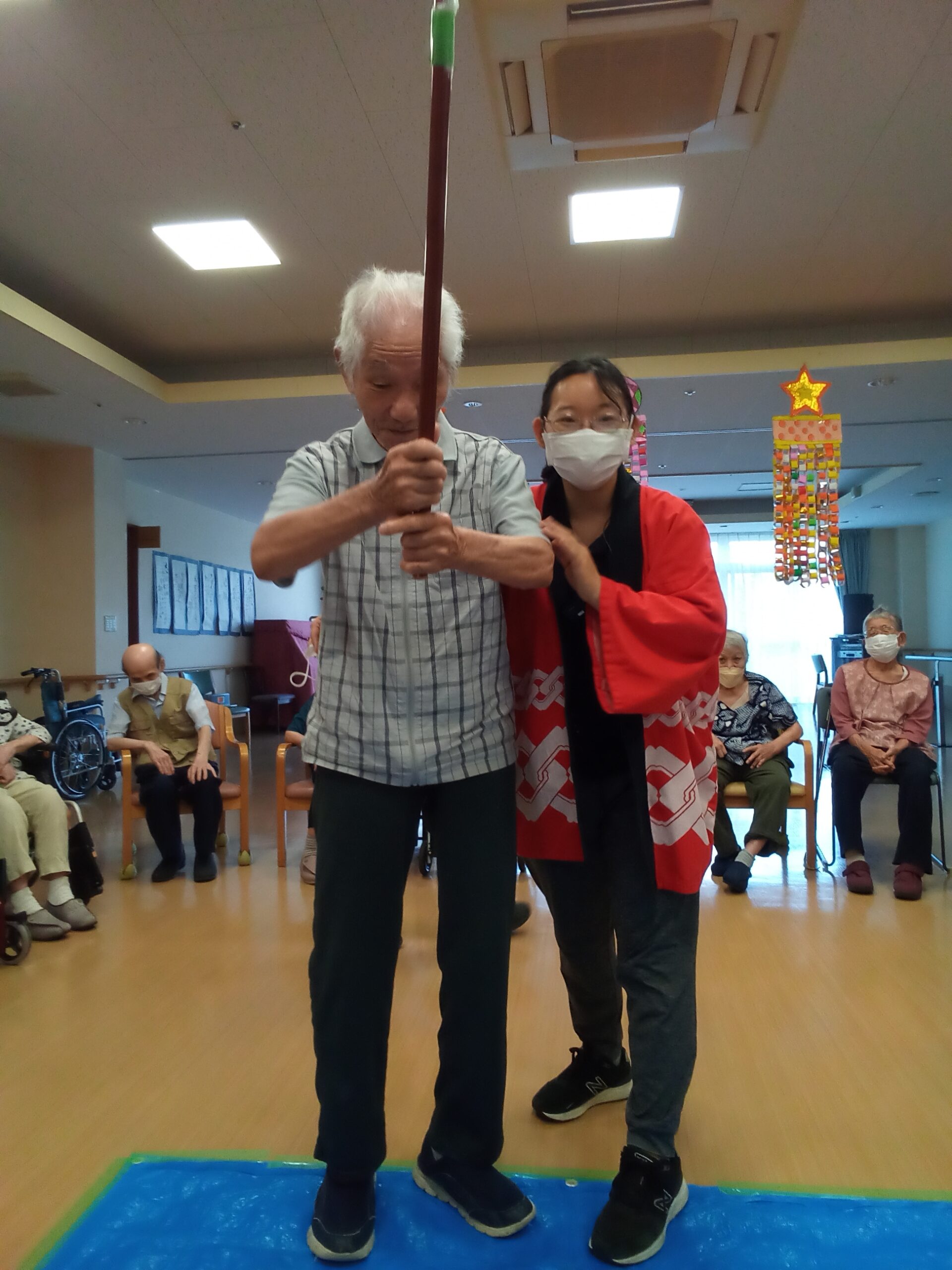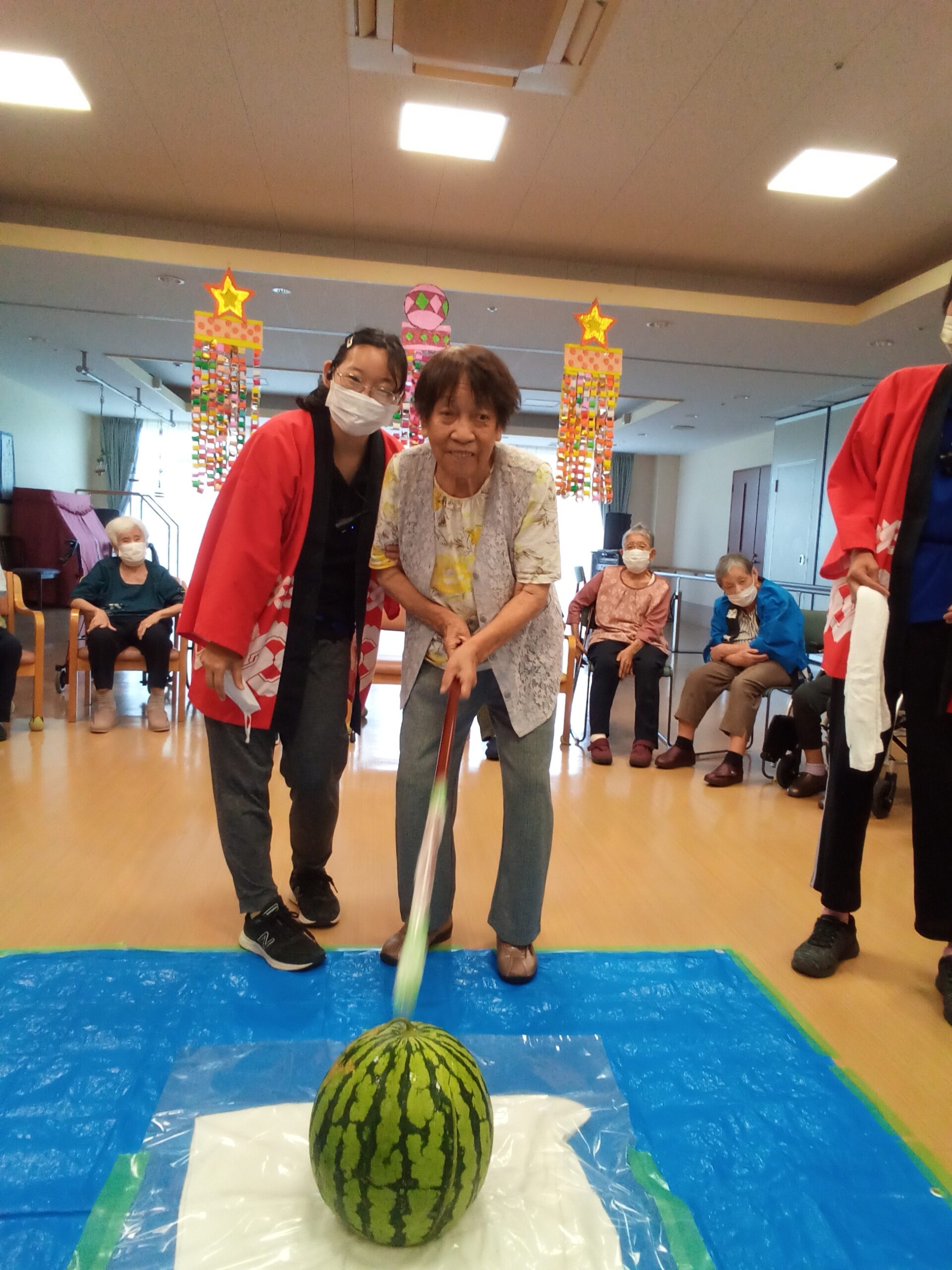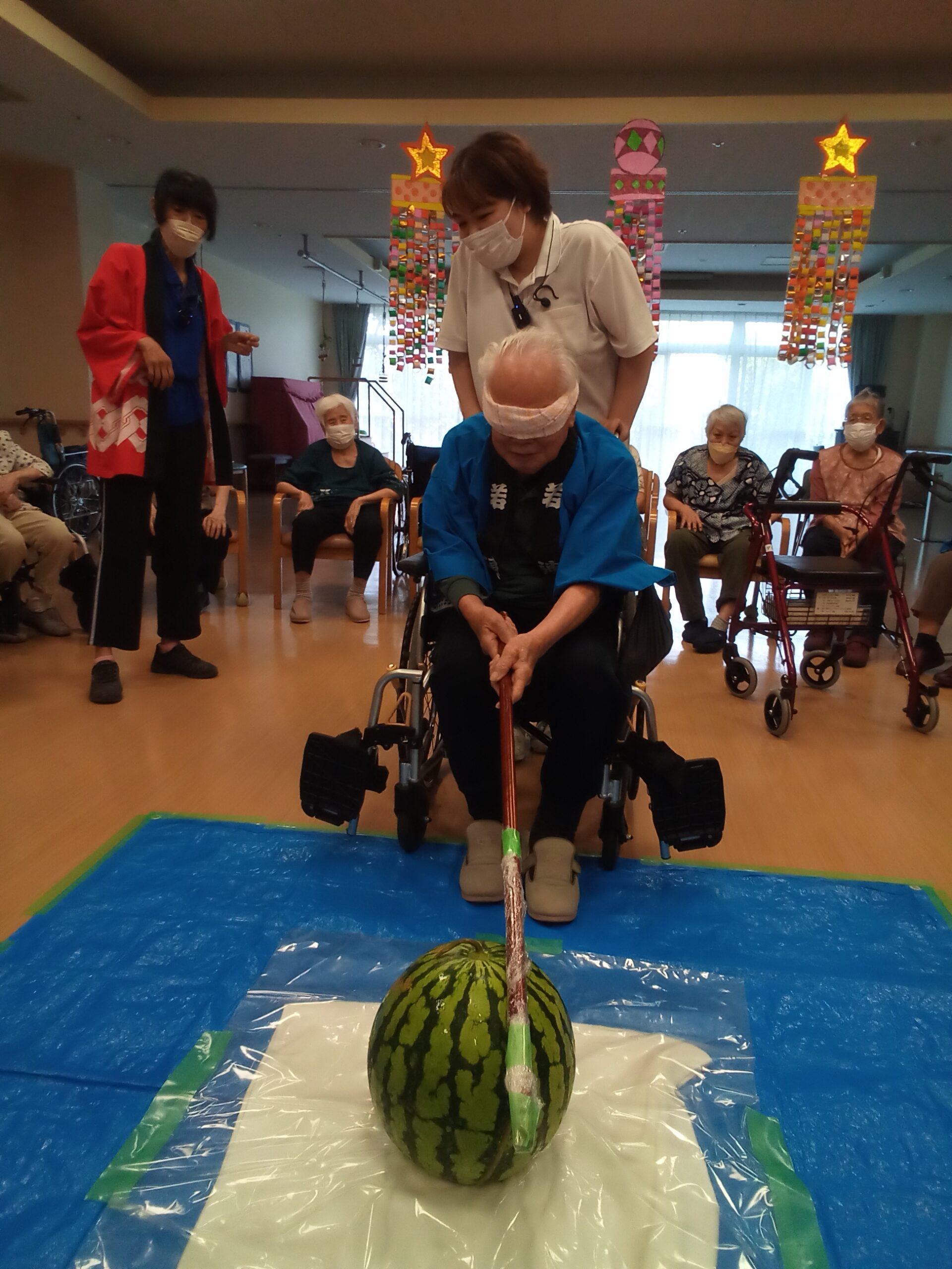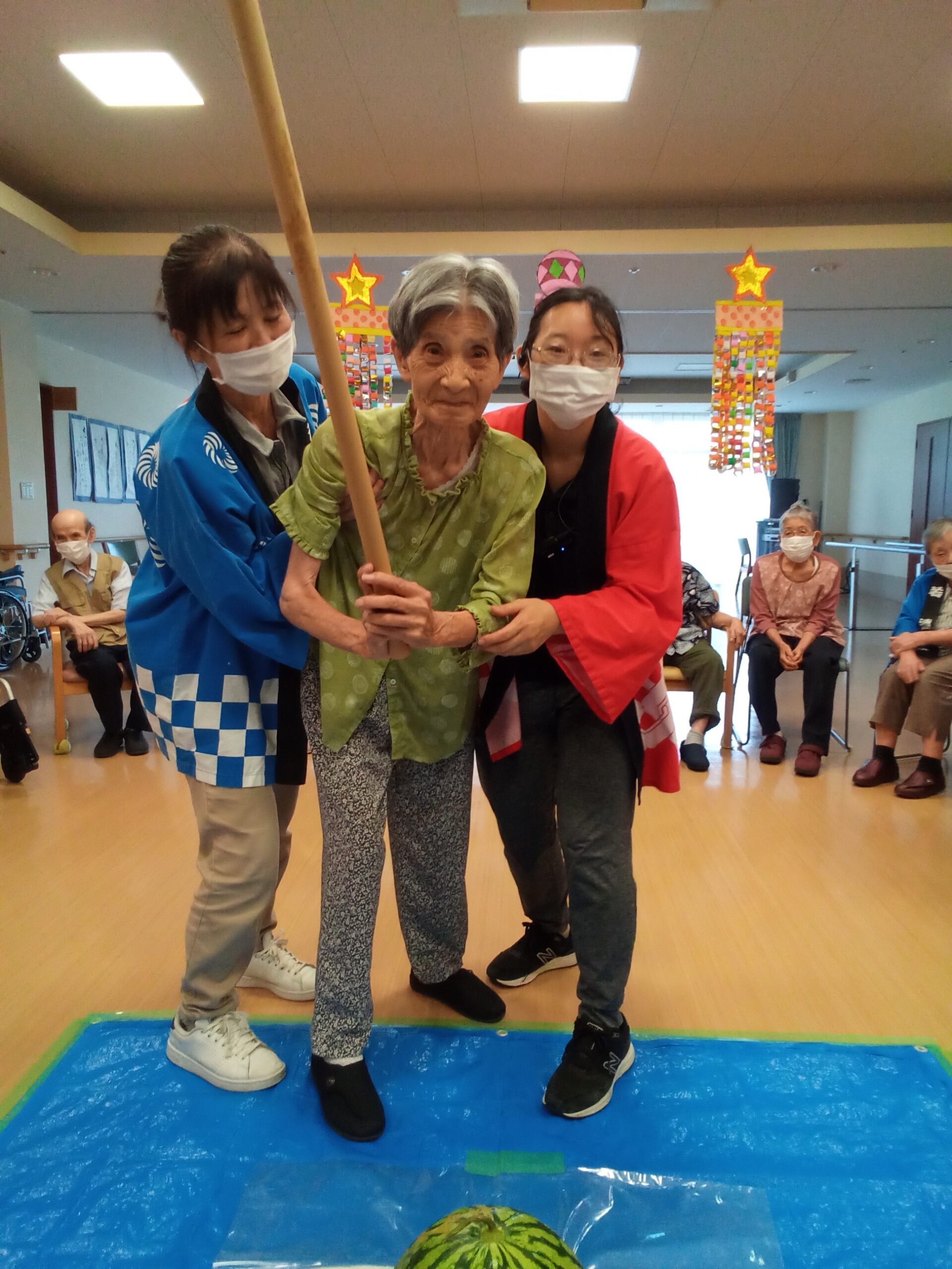 夏といえばすいか割り!くじ引きで当たった方は、目隠しをして、すいかに向かい、周りの方は「もっと右‼」「もっと左‼」と指示をしました。