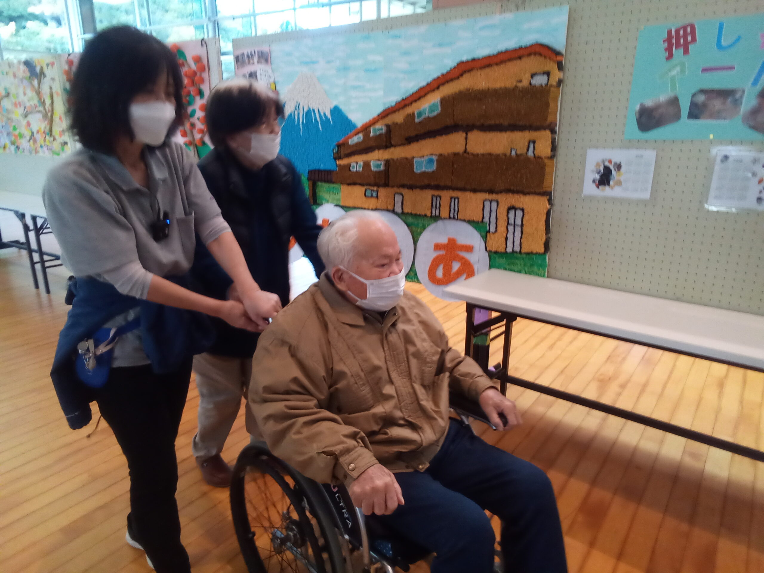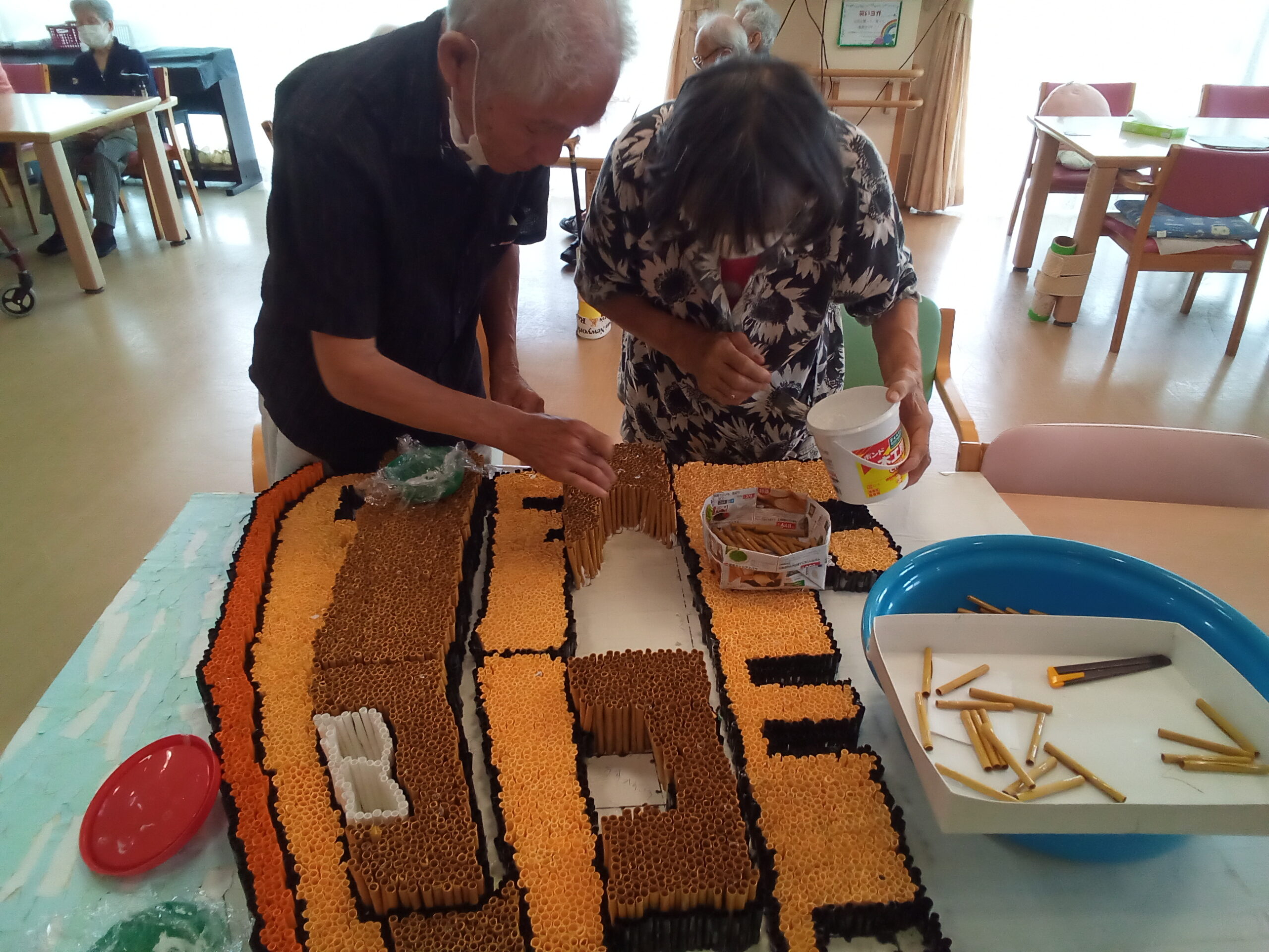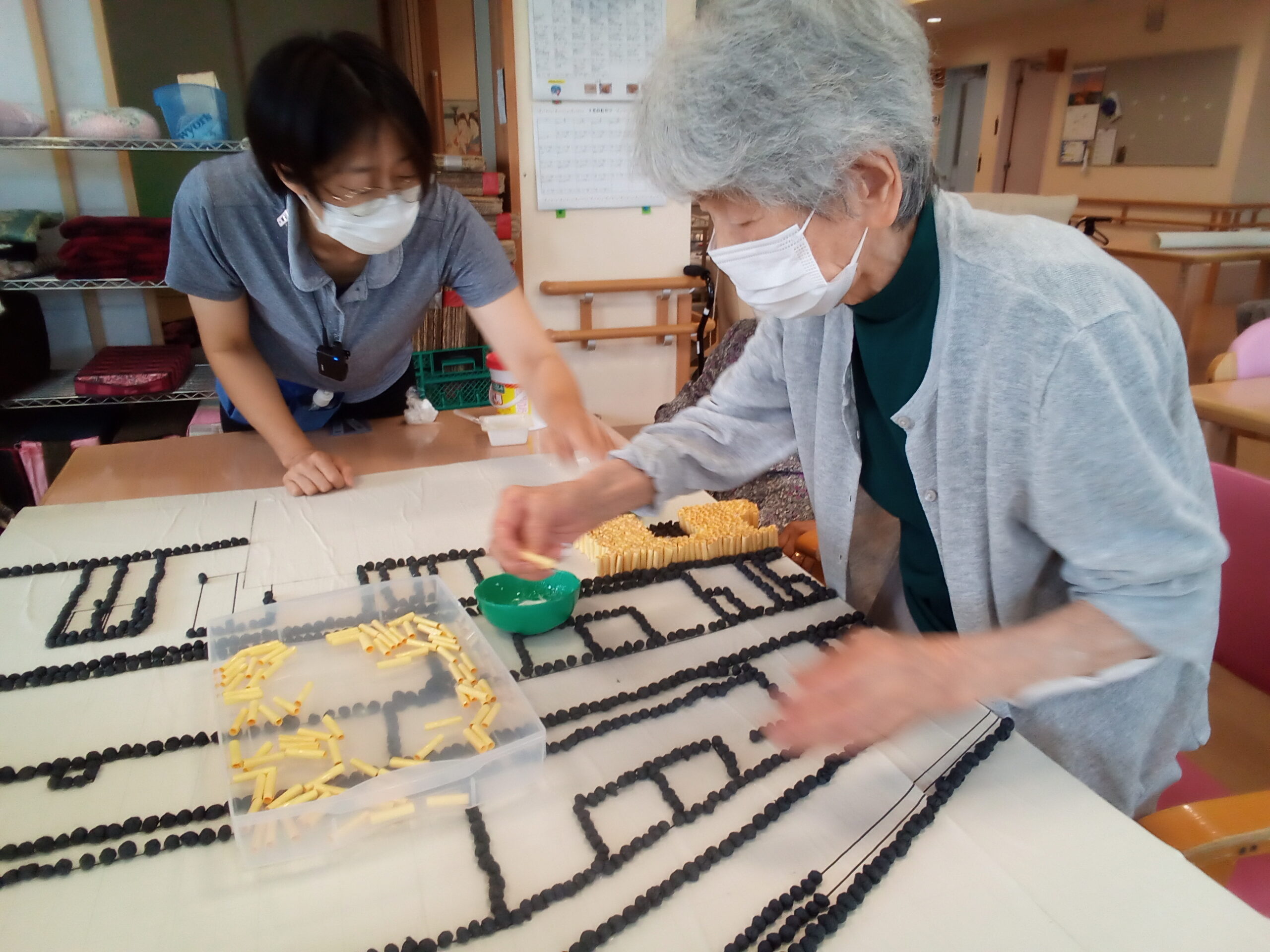 デイサービスでは、うたしあの施設外観と富士山をテーマに、細かい画用紙を丸める所からスタートしました。毎日少しずつ進めていき、