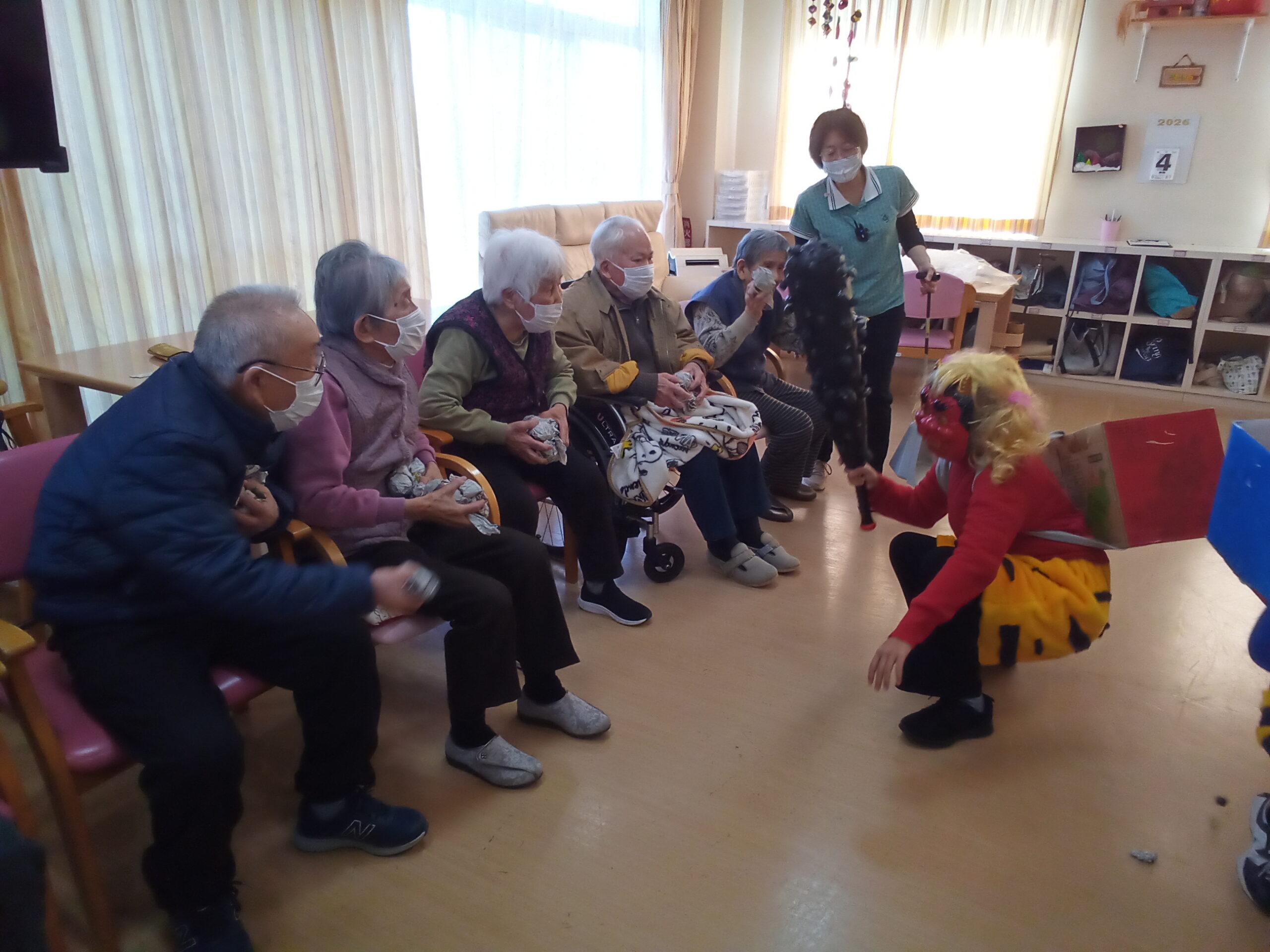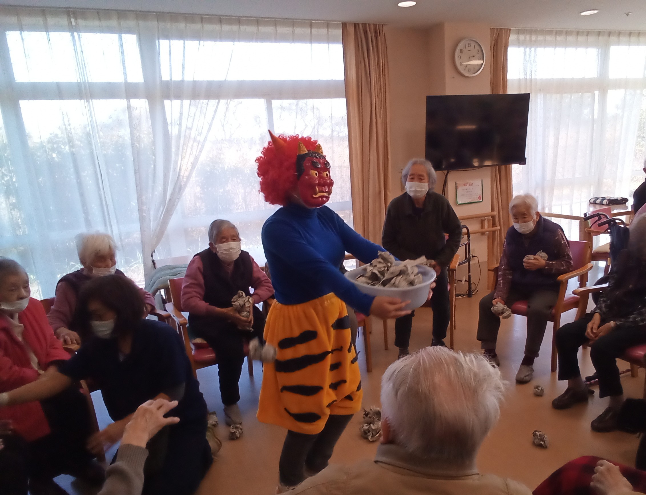 毎年恒例の節分行事を行いました。今年は、インドネシアの職員も鬼の衣装を着て、利用者様の所へ!新聞紙で作成した豆を使って「鬼は外!福は内!」